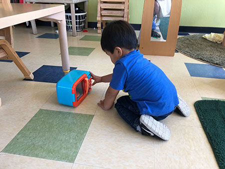 Luckily, he found a favorite toy in the classroom. It’s the same microwave that Maya has at her house!!