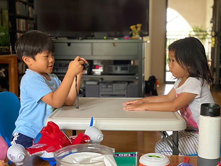 It’s had been over two months since they saw each other at school. His buddy, Ethan, came over with his dad and they both showed off their newly acquired shelter-in-place skills! It’s so cool that they both learned how to ride their two-wheel bikes at the same time and couldn’t wait to ride around the pool together.