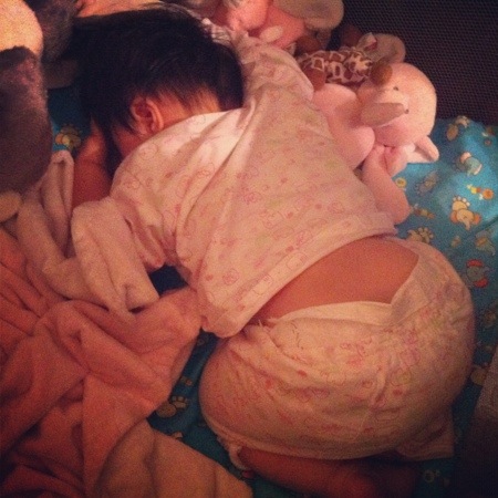 Found her sleeping like this in the morning. It was because she had a giant poop in her diaper.