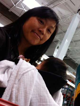 We took Janie on her first trip to Costco today and I had her in the front carrier the whole time.