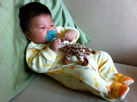 After her morning feeding, Janie was pretty content. I had to tidy things up a bit around the livingroom so I put her down next to me on the couch and she was perfectly happy in her giraffe pajamas hanging out with her giraffe buddy, and wiggling her giraffe toes. Love it.