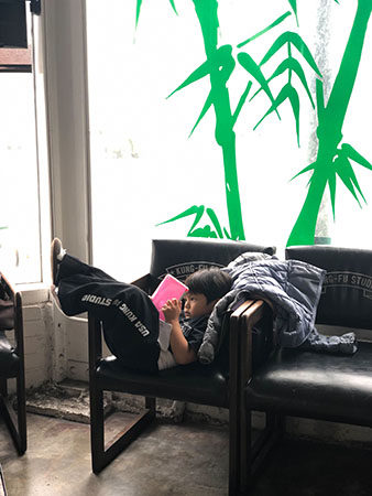 When it’s Janie’s turn to practice her kung fu, Peanut enjoys some time on the iPad. Look at how he’s chillin’ on the chair today. Ridiculous.