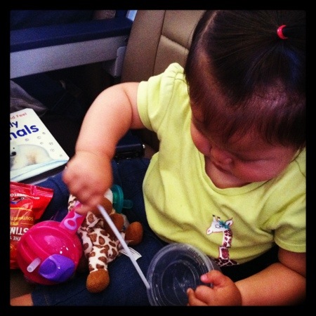 Luckily she did great on the plane. This is when the middle seat comes in handy. Our flight back to SF was not full so Janie got her own seat again. She sat buckled in and played with her toys, a plastic cup, and straw.
