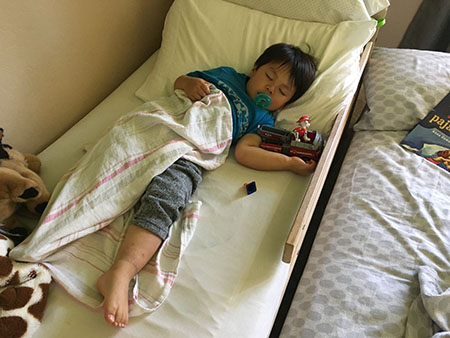 Peanut also thought it would be a good idea to bring Marshall to bed with him for nap time.