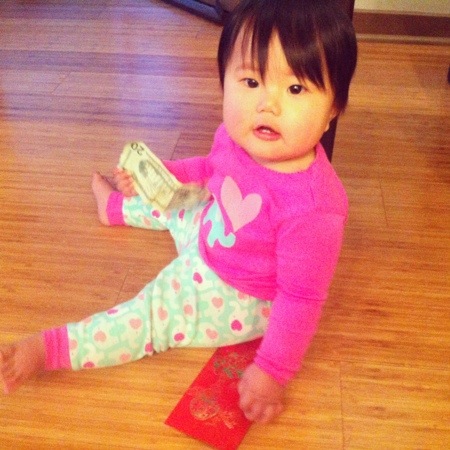 Last night, Janie went to sleep before Uncle Jimmy remembered to give her her red envelope. So she opened it this morning and enjoyed playing with the red and $green$ paper. Thanks to Uncle Jimmy and Auntie Eleen!!! Happy New Year, Everyone!