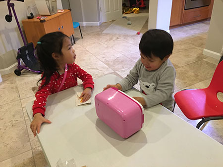 We went to Uncle Ian’s house today for dinner. All the kids sat together and Maya wanted to sit next to Peanut. She recently moved classes and hadn’t played with him in a while.