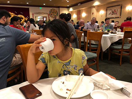 Janie had a bunch of har gow and tried some jasmine tea.