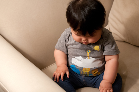 No, she’s not sleeping in this photo. It’s just a shot of her getting distracted by her shirt. I don’t blame her. It’s a cute onesie I got on the clearance rack at Baby Gap. Goes well with the skinny jeggings we already had for her. 🙂